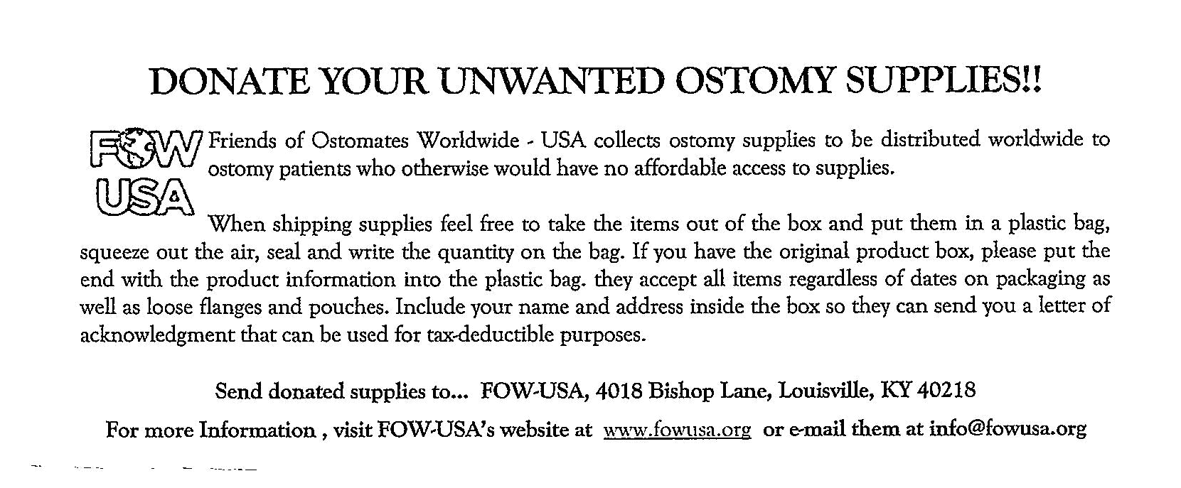 FOW-USA relies on supply donations, financial memberships and contributions